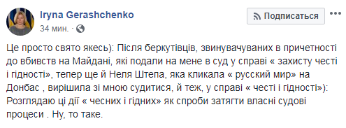"Это просто праздник какой-то. После беркутовцев, обвиняемых в причастности к убийствам на Майдане, которые подали на меня в суд по делу "защиты чести и достоинства", теперь еще и Неля Штепа, которая звала "русский мир" на Донбасс, решила со мной судиться, и тоже, в деле "чести и достоинства"", - сообщила Геращенко.