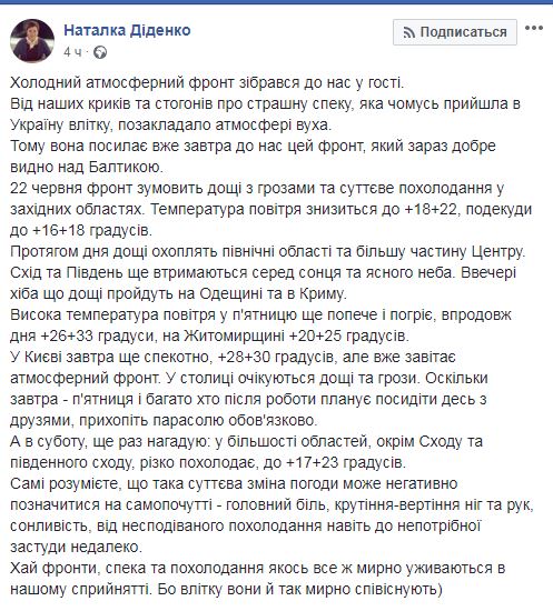 "В пятницу еще попечет и погреет, в течение дня + 26 + 33 градуса, в Житомирской области + 20 + 25 градусов. В Киеве завтра еще жарко, + 28 + 30 градусов, но уже приедет атмосферный фронт. В столице ожидаются дожди и грозы. Поскольку завтра - пятница и многие после работы планируют посидеть где-то с друзьями, прихватите зонт обязательно", - предупреждает Диденко.