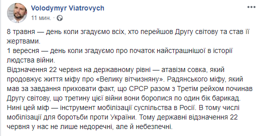 "Празднование 22 июня на государственном уровне - атавизм совка, который продлевает жизнь мифа о "Великой отечественной". Советского мифа, который имел задачу скрыть факт, что СССР вместе с Третьим рейхом начинал Вторую мировую, что треть этой войны они сражались по одну сторону баррикад. Сейчас этот миф - инструмент мобилизации общества в России. В том числе мобилизации для борьбы против Украины. Поэтому государственные празднованию 22 июня у нас не только неуместны, но и опасны", - написал Вятрович.