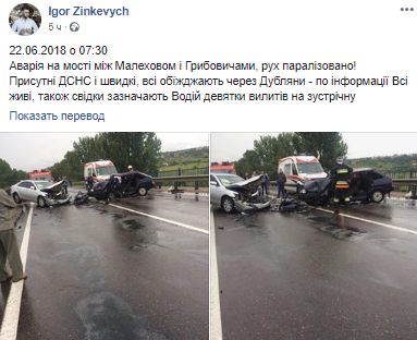 "Свидетели сообщают, что водитель "девятки" вылетел на встречку. Все живы. Так как движение заблокировано, люди объезжают через Дубляны", - написал депутат.