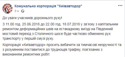 Об этом сообщили в пресс-службе "Киевавтодора" на своей странице в Facebook.