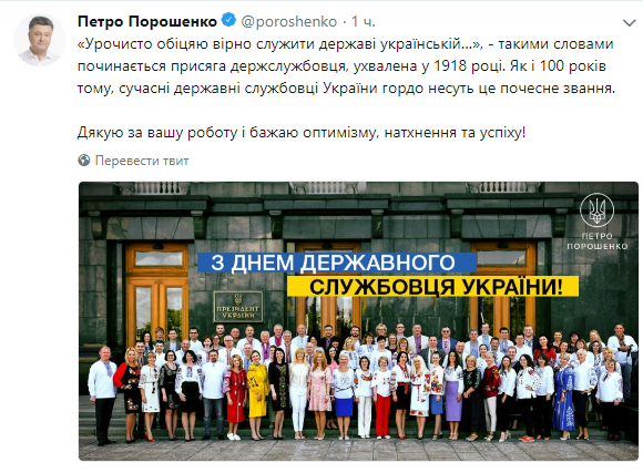 "Торжественно обещаю верно служить государству украинском...", – такими словами начинается присяга госслужащего, принятая в 1918 году. Как и 100 лет назад, современные государственные служащие Украины гордо несут это почетное звание. Спасибо за вашу работу и желаю оптимизма, вдохновения и удачи!", - написал глава государства.
