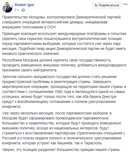 "Правительство Молдовы, контролируемое Демократической партией, совершило очередной антироссийский демарш, инициировав вчерашнее голосование в ООН", - заявил молдавский лидер.