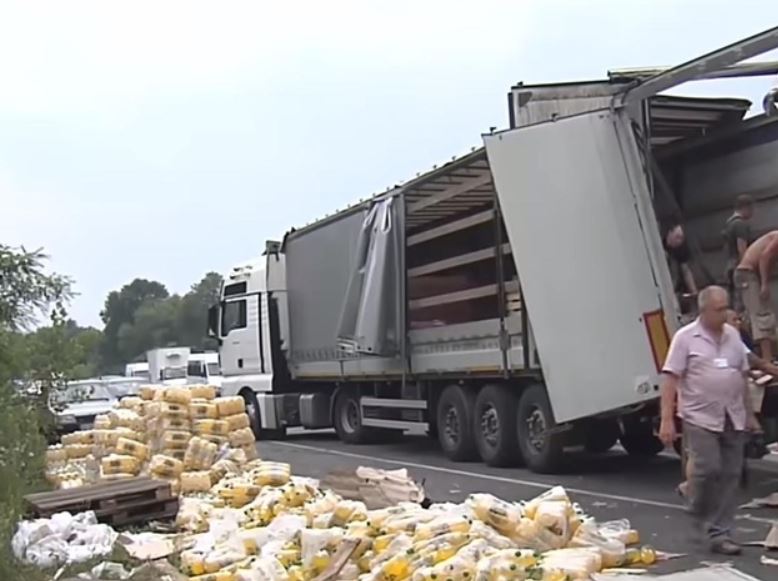 Грузовик перегородил дорогу и растерял груз, а это были сотни ящиков с газированной водой выпали на дорогу. В результате, часть воды из бутылок разлилась и трассу залило сладким лимонадом.