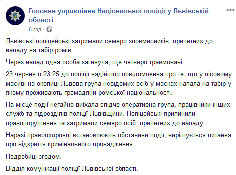 "23 июня в 23.25 в полицию поступило сообщение о том, что в лесном массиве на окраине Львова группа неизвестных лиц в масках напала на лагерь, в котором проживают граждане ромской национальности. На место происшествия немедленно выехала следственно-оперативная группа, работники других служб и подразделений полиции Львовщины. Полицейские прекратили правонарушения и задержали семь человек, причастных к нападению.
