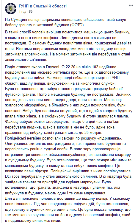 "Происшествие случилось вчера, 23 июня, в Глухове. В 22:20 на линию "102" поступило сообщение от местной жительницы о том, что в их двухэтажном доме произошел взрыв. На место происшествия выехали руководство ГУНП области, отдела полиции, взрывотехническая и кинологическая службы", - сказано в сообщении.
