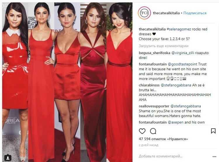 Так, в аккаунте The Catwalk Italia, где публикуются фотографии лучших нарядов знаменитостей, появился коллаж из пяти снимков Селены Гомес в красных платьях. Пользователям соцсети было предложено выбрать лучшее из них.