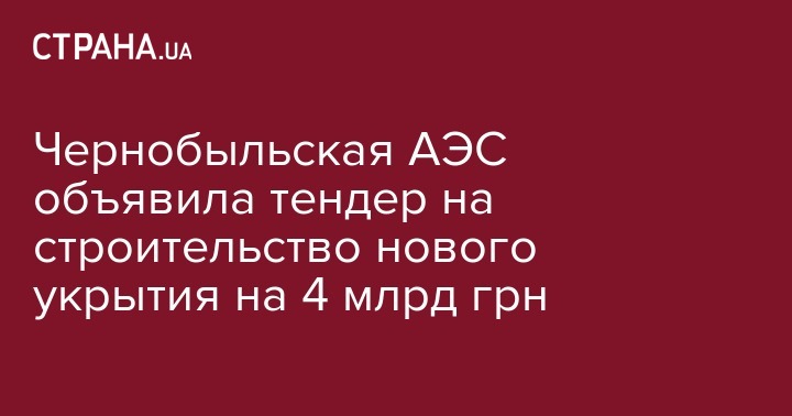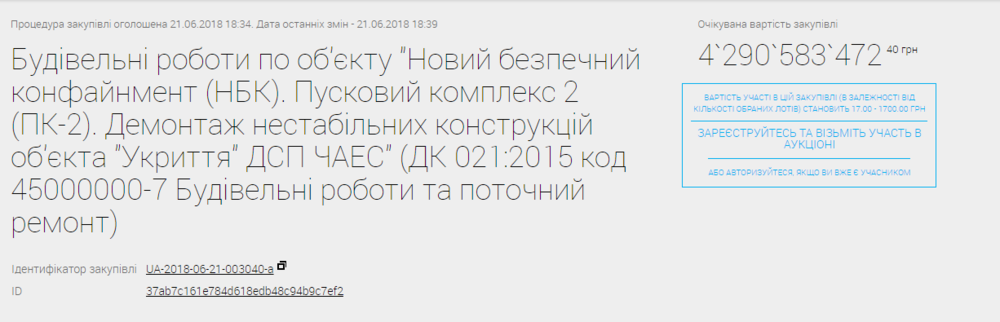 "Объявлен тендер на строительные работы по объекту "Новый безопасный конфайнмент (НБК)"; пусковой комплекс 2 (ПК-2); демонтаж нестабильных конструкций объекта "Укрытие "ГСП ЧАЭС". Ожидаемая стоимость закупки - 4 290 583 472 грн", - указывается в информации о тендере.