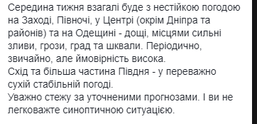 "Завтра на Западе ожидаются дожди, которые распространятся на Житомирскую и Винницкую. И еще может пойти дождь в районе Приазовья. Большинство областей построят во вторник в сухом воздухе.