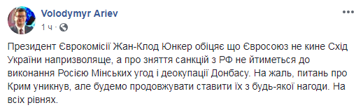 "Президент Еврокомиссии Жан-Клод Юнкер обещает, что Евросоюз не бросит Восток Украины на произвол судьбы, а о снятии санкций с РФ не будет идти речь до выполнения Россией Минских соглашений и деоккупации Донбасса. К сожалению, вопросов о Крыме избежал, но будем продолжать ставить их при любой возможности. На всех уровнях", - написал Арьев в своей странице в Facebook.