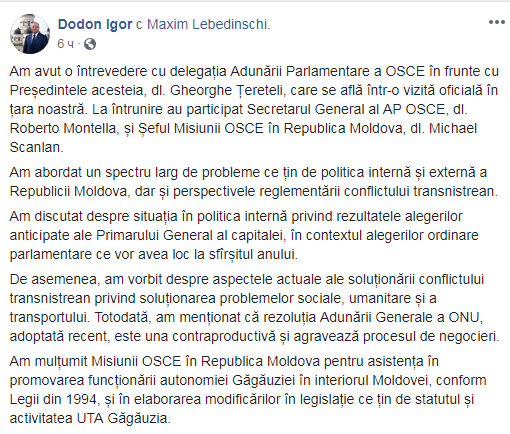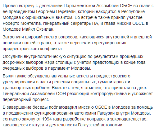 Об этом шла речь на его встрече с председателем Парламентской ассамблеи ОБСЕ Георгием Церетели в Кишиневе, сообщил президент Молдовы в своем Facebook.