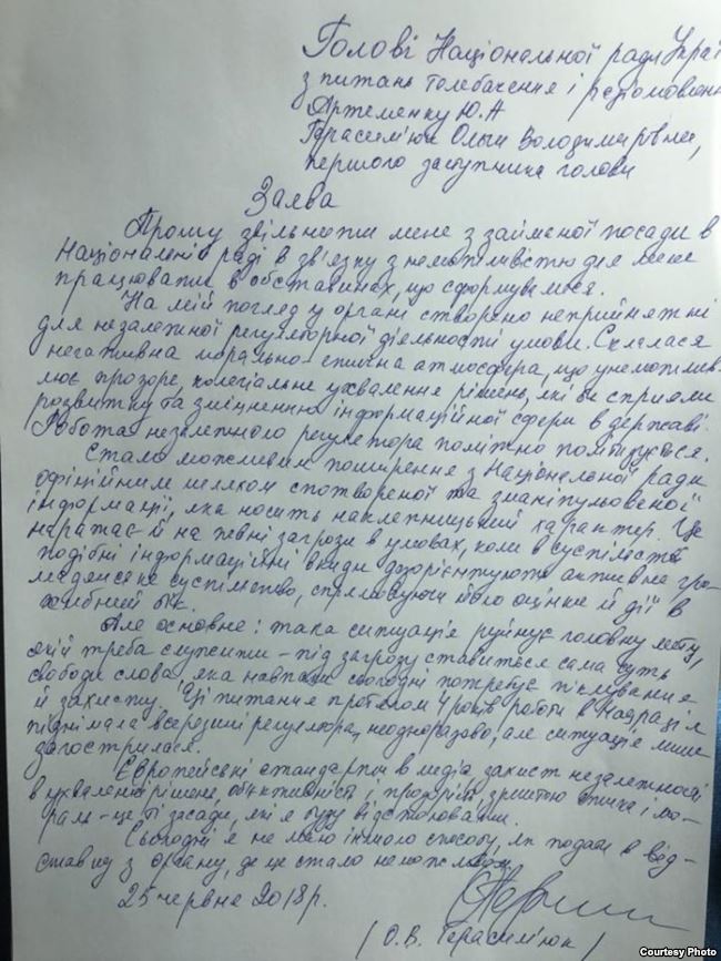 При увольнении Ольга Герасимюк предоставила фотокопию своего заявления об увольнении, в котором отметила "созданные неприемлемые для независимой регуляторной деятельности условия".