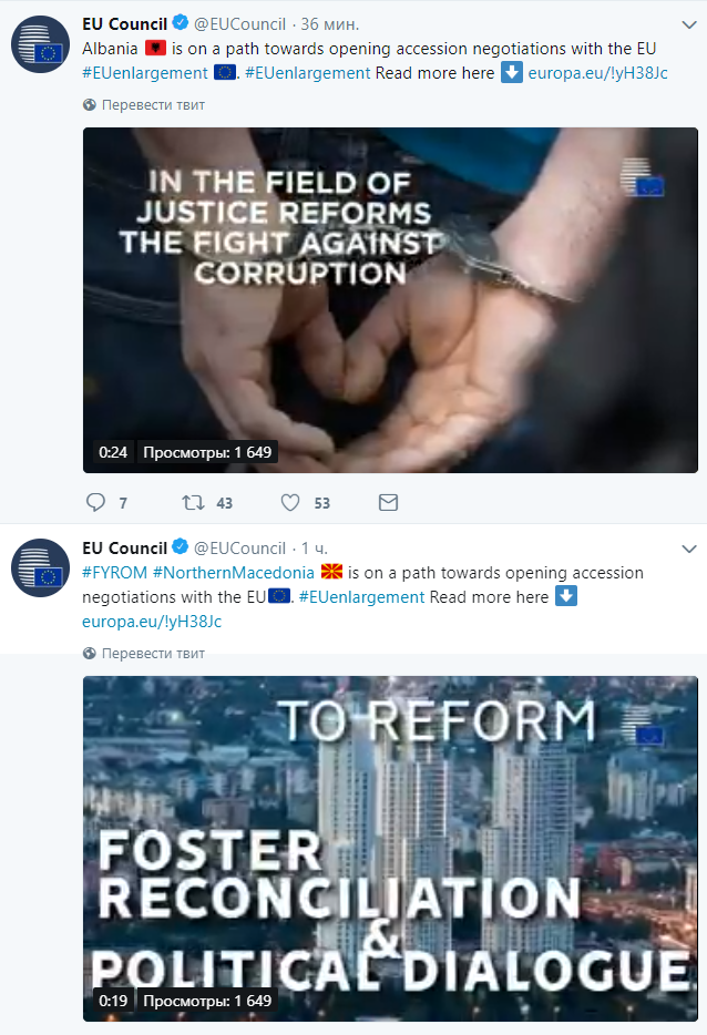"Государства-члены определили на сегодняшнем заседании Совета по общим вопросам путь к открытию переговоров о вступлении (в Евросоюз - Прим.Ред.) с бывшей югославской республикой Македонией и Албанией в июне 2019 года", - говорится в сообщении пресс-службы Совета ЕС, опубликованном в Твиттере.