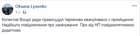 "Коллектив Высшего совета правосудия срочно эвакуирован из помещения. Поступило сообщение о заминировании. О ходе чрезвычайного происшествия сообщим дополнительно", - написала она.