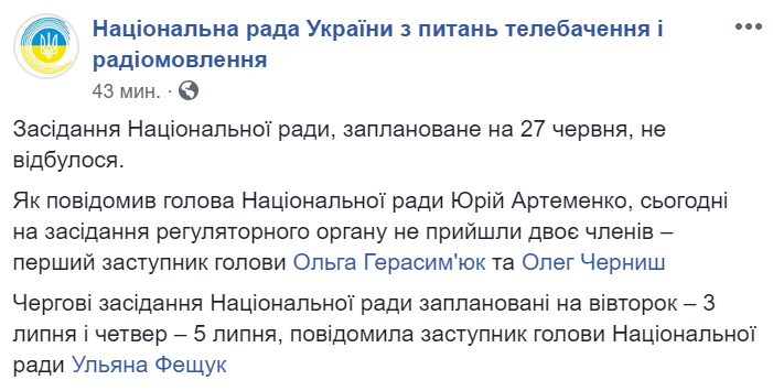 Позже Нацсовет официально заявил, что заседание переносится из-за отстутствия кворума. Ближайшие заседания назначены на 3 и 5 июля.