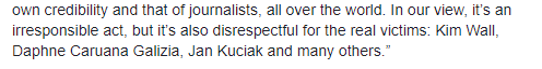Также EFJ напомнило о деле Бабченко и его поддельном убийстве "Мы ожидаем от украинских властей полной прозрачности в этой операции. Они еще не объяснили, почему именно нужно было подделывать убийство. Вместо этого ясно, что Украина сильно подорвала свой авторитет и авторитет журналистов во всем мире. На наш взгляд, это безответственный поступок, но это создает неуважительное отношение к настоящим жертвам, таким как Ким Валь, Дафна Каруана Галиция, Ян Кучак и многие другие".