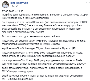 Как сообщил на своей странице в Facebook координатор общественной организации "Варта 1", депутат Львовского городского совета Игорь Зинкевич, за рулем Volvo находился посол Швейцарии в Украине.