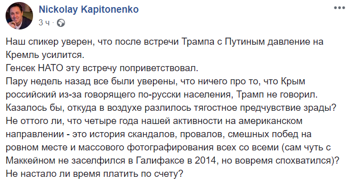 Не оттого ли, что четыре года нашей активности на американском направлении – это история скандалов, провалов, смешных побед на ровном месте и массового фотографирования всех со всеми ... ? Не настало ли время платить по счету?" – написал он в Facebook.