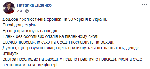 Синоптик Наталья Диденко рассказал, про дождевую прогностическую хронику на 30 июня в Украине.