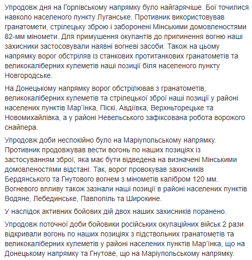 "В течение дня на Горловском направлении было больше всего обстрелов. Бои шли вокруг населенного пункта Луганское. Противник использовал гранатометы, стрелковое оружие и запрещенные минскими договоренностями 82-мм минометы. Также на этом направлении враг обстрелял из станковых противотанковых гранатометов и крупнокалиберных пулеметов наши позиции возле населенного пункта Новгородское", - сказано в сообщении.
