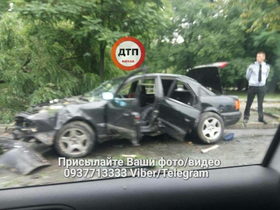 Audi 100 двигалась со стороны Демеевской площади по Голосеевскому в сторону Одесской площади. По неизвестной причине машина выехала на полосу встречного движения и врезалась в столб, потом снесла ограждение и дерево.