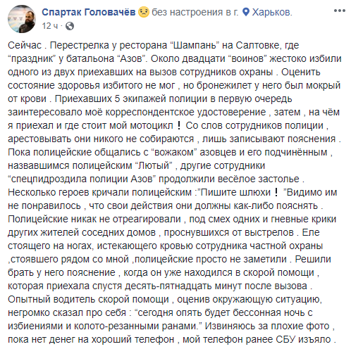 "Перестрелка у ресторана "Шампань" на Салтовке, где "праздник" у батальона "Азов". Около двадцати "воинов" жестоко избили одного из двух приехавших на вызов сотрудников охраны. Оценить состояние здоровья избитого не мог, но бронежилет у него был мокрый от крови. Со слов сотрудников полиции, арестовывать они никого не собираются, лишь записывают пояснения", - рассказал журналист.