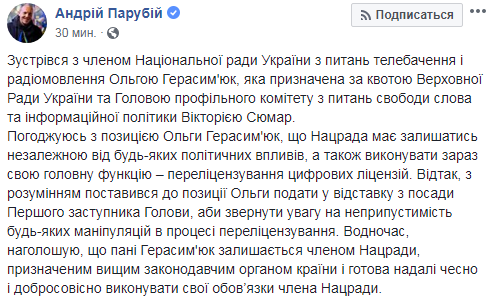 Спикер Верховной Рады Андрей Парубий объяснил отставку заместителя председателя главы Нацсовета по вопросам телевидения и радиовещания Ольги Герасимюк. По его словам, она была вызвана "желанием избежать манипуляций в процессе перелицензирования".