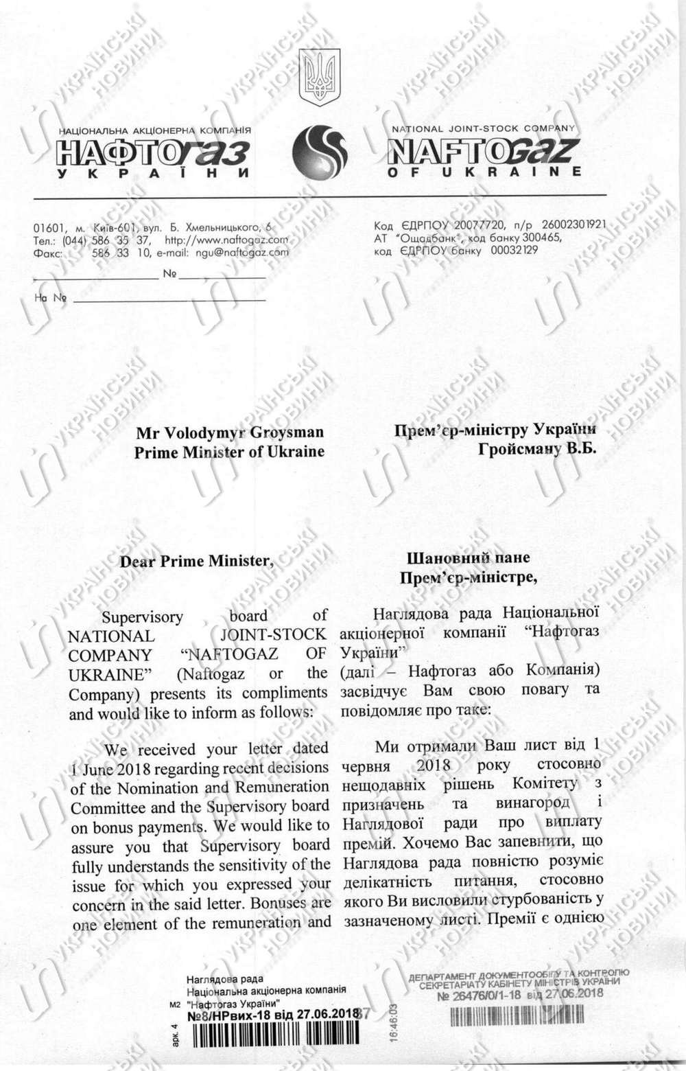 Как сообщала "Страна", 6 июня Гройсман сообщил, что попросил набсовет "Нафтогаза" пересмотреть решение по премированию правления за победу в Стокгольмском арбитраже над российской компанией "Газпром".