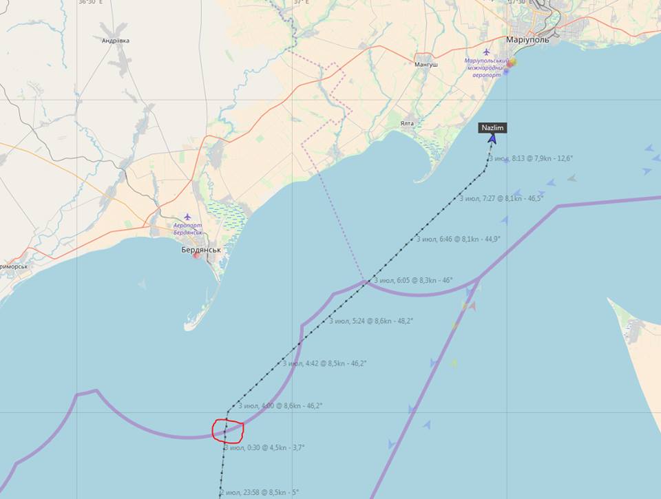 В ночь на 3 июля, в Азовском море к югу от Бердянска, почти в одной точке корабль береговой охраны ФСБ России задержал два судна, следовавших в Мариуполь и обратно.