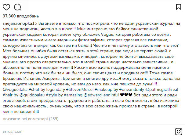 "Россия всю жизнь поддерживала меня гораздо больше, потому что, как бы там ни было, они своих ценят и продвигают! Тоже самое Бразилия, Испания, Америка , Британия и многие другие...", - добавила она.