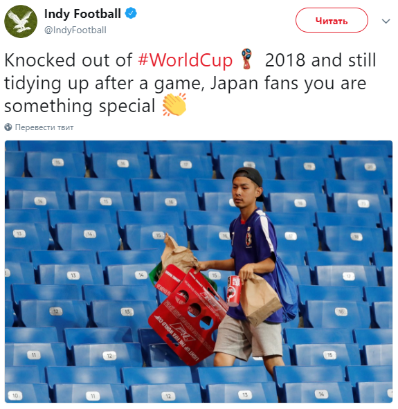 Японские фанаты тоже помогли с уборкой "Ростов-арены". Они принесли с собой мешки и сложили туда мусор с трибун. Похожим образом болельщики сборной Японии уже поступали после матча группового этапа в Саранске.
