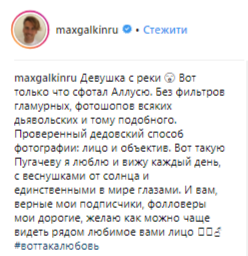 "Вот только сфотал Аллусю. Без фильтров гламурных, фотошопов всевозможных дьявольских и тому подобного. Проворный дедовский способ фотографии: лицо и объектив. Вот такую ​​Пугачеву я люблю и вижу каждый день, с веснушками от солнца и единственными в мире глазами. И вам, верные мои подписчики, фоллоферы мои дорогие, желаю как можно чаще видеть рядом любимое вами лицо ", - пожелал он.