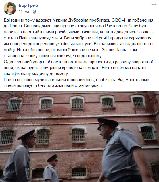 "Адвокат Марина Дубровина пробилась в СИЗО-4 на свидание к Павлу. Он сообщил, что во время этапирования в Ростов-на-Дону был жестоко избит другими российскими заключенными, когда те узнали по какой статье Паша обвиняется. Они забрали все вещи и продукты, которые накануне ему передали украинские консулы. Он остался в одих шортах и майке. Ни средств гигиены, ни сменного белья нет. По словам Павла, такое отношение со стороны других заключенных будет и дальнейшем.