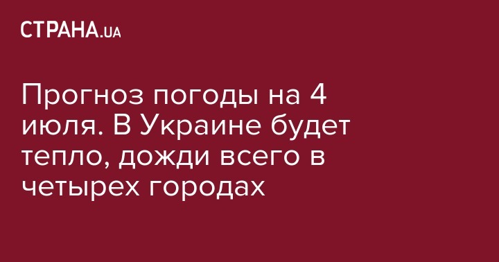 В среду, 4 июля, в Украине будет теплая погода, преимущественно без осадков. Краткосрочные дожди обещают в Чернигове, Сумах, Хмельницком и Одессе. На большей части страны ожидается сухая переменно-облачная погода.