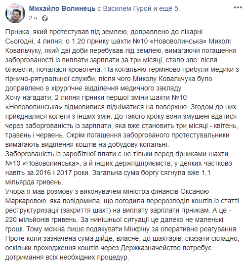 Волынец 3 июля говорил с исполняющей обязанности министра финансов Оксаной Маркаровой. Она сообщила, что согласовала перераспределение средств из статьи реструктуризации (закрытие шахт) на выплату зарплаты горнякам, а это 220 миллионов гривен.