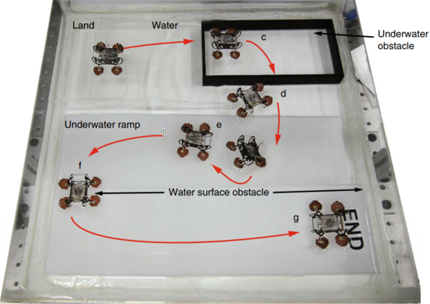 Исследователи продемонстрировали способности робота, испытав его на полосе препятствий. Сначала робот преодолел небольшое расстояние на суше, затем перешел на поверхность воды и проплыл над подводным препятствием, после этого утонул и преодолел надводное препятствие, а затем выбрался на берег и снова прошел небольшое расстояние по суше.