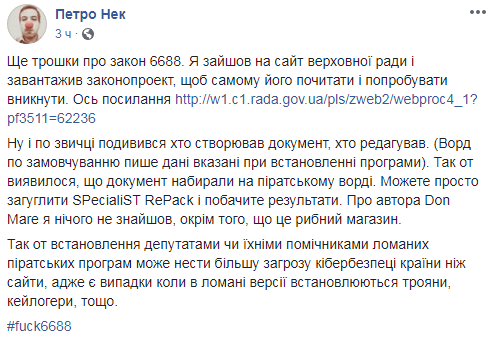 Предлагающий ввести, фактически, абсолютную интернет-цензуру в Украине законопроект № 6688 готовили на "пиратском" программном обеспечении. Документ о блокировке любых сайтов в Украине написали на версии программы Microsoft Word от некоего Don Mare.