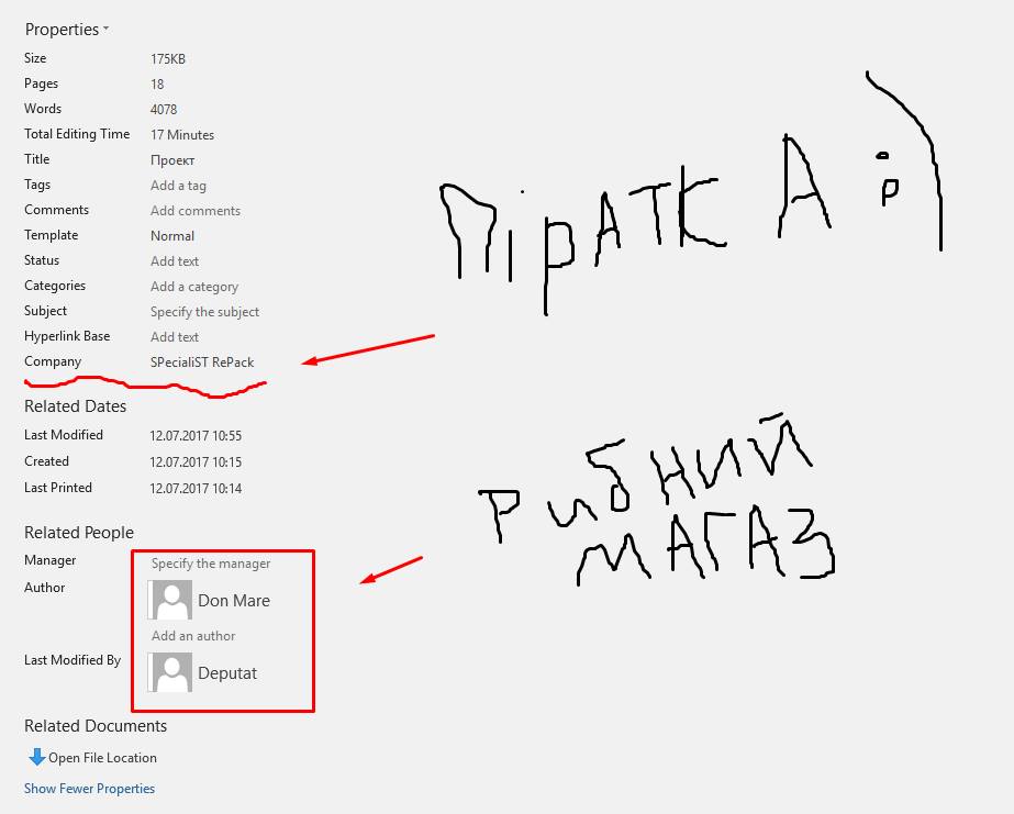 Ну и по привычке посмотрел кто создавал документ, кто редактировал. (Ворд (Microsoft Word - Прим.Ред.) по умолчанию пишет данные, указанные при установке программы). Так вот оказалось, что документ набирали на пиратском Ворде. Вы можете просто загуглить SPecialiST RePack и увидите результаты. Об авторе Don Mare я ничего не нашел, кроме того, что это рыбный магазин.
