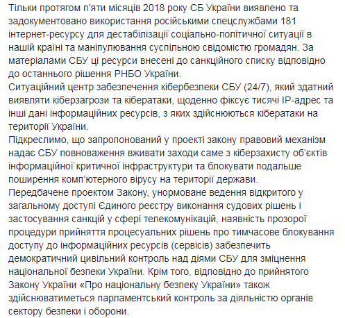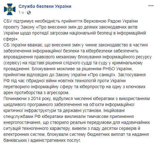 "СБ Украины считает, что внесение изменений в действующее законодательство в части обеспечения информационной безопасности и кибербезопасности обеспечит внедрение правового механизма блокировки информационного ресурса (сервиса) на основании решения следственного судьи и суда в уголовном производстве.