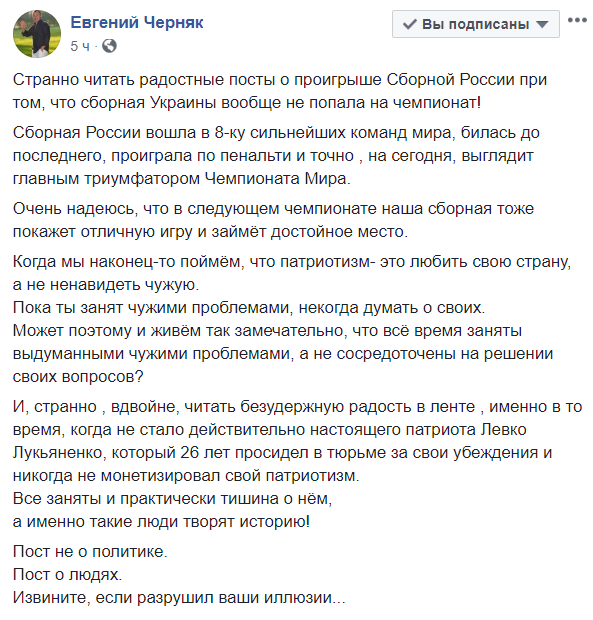 "Украина вполне могла быть на месте Хорватии в ЧМ. Ведь это те, кому всякие дятлы сейчас аплодируют, в последний момент выбили нашу сборную в отборе. И вот тогда такой результат, как сегодня, был бы гигантским поводом для гордости. А так это жалкое зрелище злорадства наших диванных ура-патриотов вызывает омерзение. Опять это тупое "заграница нам поможет". Смешно и глупо. Они играют за себя. Во всем. И плевать хотели на ваши эмоции.