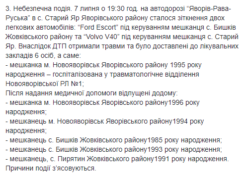 По данным департамента, авария произошла вчера 7 июля, в 19:30 на автодороге "Яворов-Рава-Русская" в селе Старый Яр Яворовского района. В столкновении "FORD Escort" и "Volvo" получили травмы шесть человек, которых доставили в больницу.