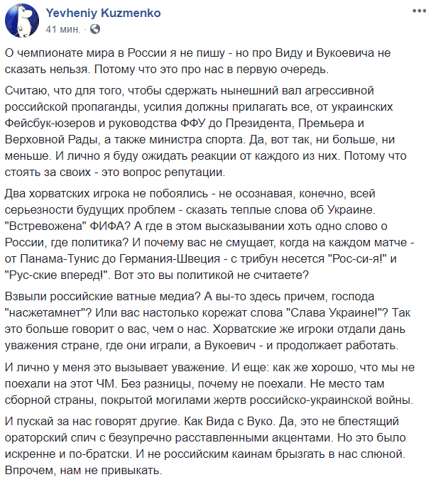 "Считаю, что для того, чтобы сдержать нынешний вал агрессивной российской пропаганды, усилия должны прилагать все, от украинских Фейсбук-юзеров и руководства ФФУ до Президента, Премьера и Верховной Рады, а также министра спорта. Да, вот так, ни больше, ни меньше. И лично я буду ожидать реакции от каждого из них. Потому что стоять за своих - это вопрос репутации".