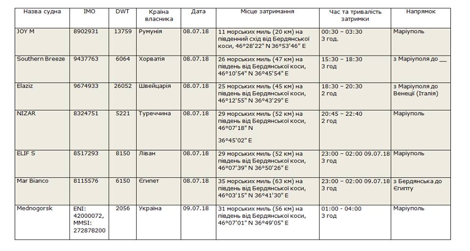 "8 июля с 00:30 до 23:00 катера береговой охраны пограничной службы ФСБ РФ перехватили шесть судов, направлявшихся в/из Бердянска или Мариуполя. Еще одно судно было перехвачено около 01:00 в ночь на 9 июля в том же районе", - написал Клименко.