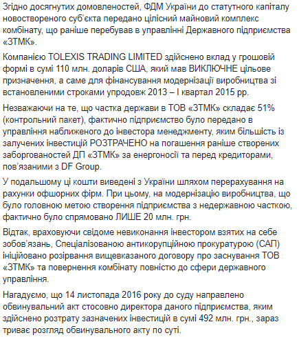 "Компанией Tolexis Trading Limited осуществлен вклад в денежной форме в сумме 110 млн долларов США, который имел исключительное целевое назначение, а именно для финансирования модернизации производства с установленными сроками в течение 2013 - I квартал 2015 года. Несмотря на то, что доля государства в ООО "ЗТМК" составляет 51% (контрольный пакет), фактически предприятие передано в управление приближенного к инвестору менеджмента, которым большинство из привлеченных инвестиций растрачены на погашение ранее созданных задолженностей ГП "ЗТМК" за энергоносители и перед кредиторами, связанными с DF Group", - сообщили в САП.