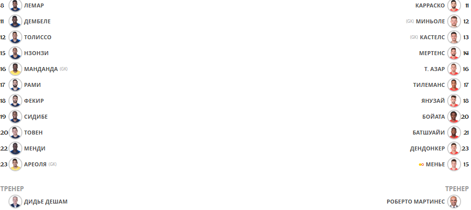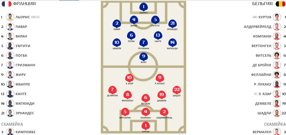 20.25 Наставник сборной Франции Дидье Дешам расставил игроков по своей любимой схеме 4-2-3-1 с Жиру впереди, Матюиди сыграет слева. При этом бельгийцы сыграют по очень атакующей схеме 3-5-2.
