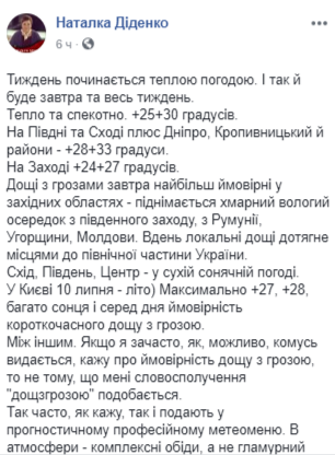 "Между прочим. Если я часто, как, возможно, кому-то кажется, говорю про вероятность дождя с грозой, то не потому, что мне словосочетание "дождьсгрозой" нравится. Так часто, как говорю, так и подают в прогностическом профессиональном метеоменю", - уточнила Диденко.