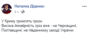 "В Крыму гремят грозы. Высокая вероятность гроз уже - в Черкасской, Полтавской (областях), на юго-западе Украины,"- написала она.