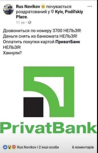 21.41. Банкоматы, терминалы пополнения счёта и другие устройства, связанные с электронными сервисами Приватбанка вышли из строя вечером 9 июля  не только в Киеве, о сбоях сообщают из Одессы, Мариуполя, Николаева, Полтавы и других городов. В соцсетях распространяются слухи о том, что банк подвергся хакерской атаке.