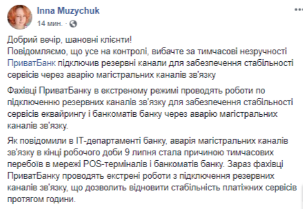 "Как сообщили в ИТ-департаменте банка, авария магистральных каналов связи в конце рабочего дня 9 июля стало причиной временных перебоев в сети POS-терминалов и банкоматов банка. Сейчас специалисты ПриватБанка проводят экстренные работы по подключению резервных каналов связи, что позволит восстановить стабильность платежных сервисов в течение часа", - говорится в сообщении.