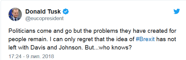 "Политики уходят и приходят, однако проблемы, ими созданные для людей, остаются. Я могу лишь cожалеть, что идея Brexit не ушла вместе с Дэвисом и Джонсоном. Хотя... кто его знает?" - написал Туск.